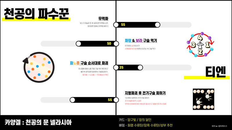 노말에선 보스 무력화 후 시계방향으로 돌아가는 파란 구슬과 보라 구슬이 '파 - 보 - 파 - 보' 식의 순서대로 나오지만